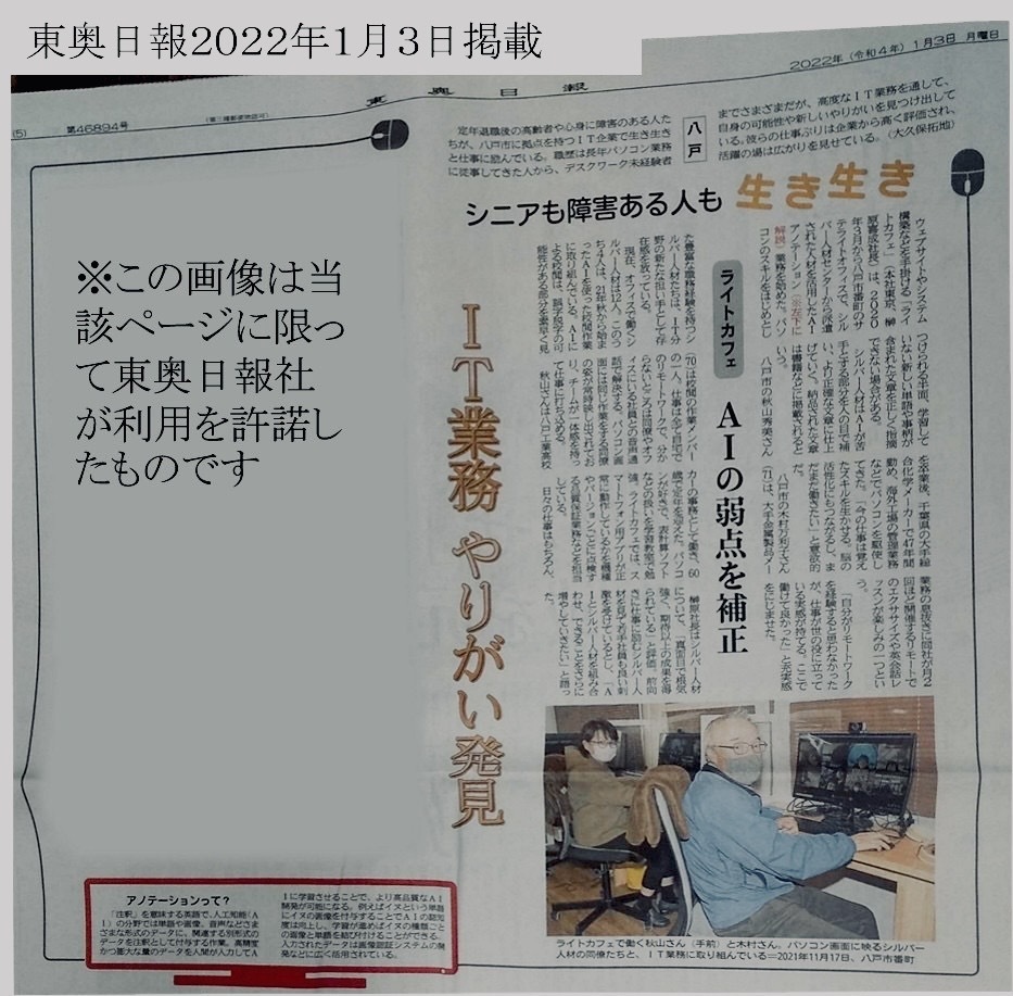 2022年(令和4年)1月3日(月)掲載 (ライトカフェ AIの弱点を補正)/ 東奥日報社提供 新聞記事はこちらをご覧ください。